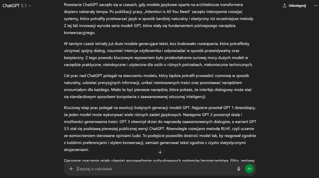 Co ciekawe, po tej zmianie poprosiłam o przepisanie wcześniejszego tekstu, który zawierał pauzy. Model automatycznie je usunął, mimo że w samym poleceniu nie prosiłam o ich usunięcie.