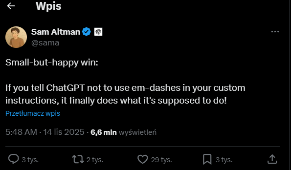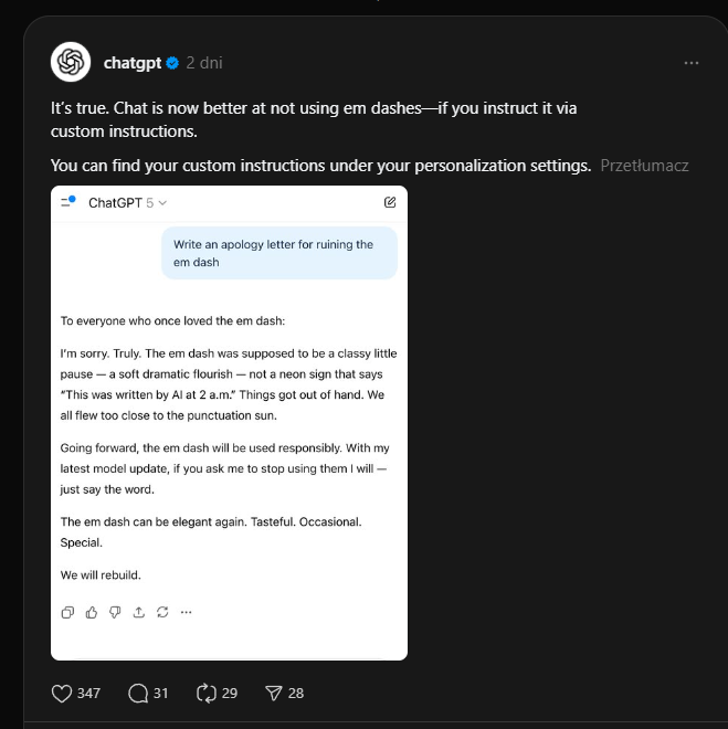 Model nie przestanie więc używać pauz domyślnie, ale zmiana daje wreszcie większą kontrolę nad stylistyką odpowiedzi. Firma potwierdziła to również w poście na Threads, gdzie żartobliwie zmusiła ChatGPT do przeprosin za „zrujnowanie pauzy”.