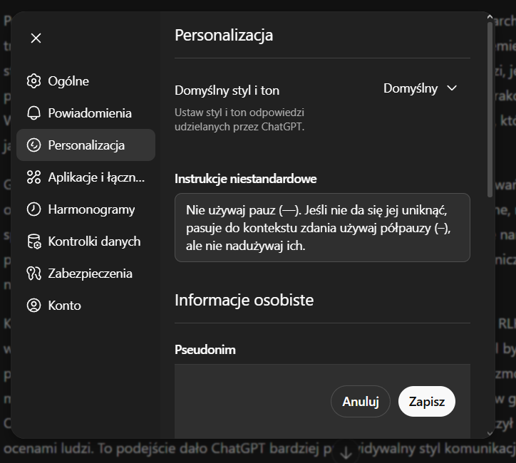 Natomiast po dodaniu instrukcji w personalizacji, w 3 na 3 próby model w ogóle nie zawierał pauz. W personalizacji wpisałam prostą instrukcję: „Nie używaj pauz (—). Jeśli nie da się jej uniknąć, pasuje do kontekstu zdania używaj półpauzy (–), ale nie nadużywaj jej”.